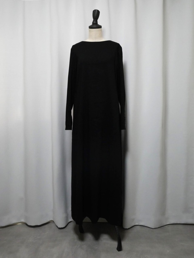 ただただ、シンプルな黒のロングワンピースを仕立てようと想い、生まれた一枚。 たっぷりとフレアをとり、動くたびに豊かな表情を見せます。 襟元は浅めのボートネック。 ネックレスやスカーフが映える余白を残しました。 背中にはファスナーあき。 両サイドにはポケットを備え、機能性にも配慮しました。 こちらにディティールの説明を掲載しております。 https://mi-hey.com/blog/?p=1345 Size. 着丈:約130cm バスト:約96cm Qua. linen40% / wool40% / silk18% / polyurethane2% ※POPUP期間中は、店頭販売を優先させていただく場合がございますので、ご了承ください。